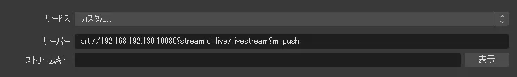 OBS側の設定は、ストリームキーを空にし、サーバーを以下のように設定します。